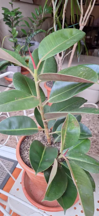 Planta de interior Ficus Elástica, también conocida como árbol del caucho. Tiene dos tallos principales, sus hojas son grandes y brillantes, con un característico borde rojizo en los brotes nuevos TODOS MIS FICUS, NO SON DE INVERNADERO, POR LO QUE NO SE MUEREN Y SE HACEN MUY GRANDES. PARA RECOGER EN BARCELONA - Hojas grandes y lustrosas. - Brotes nuevos con borde rojizo.