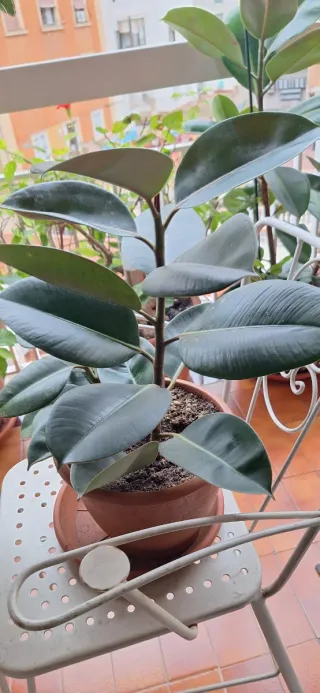 Planta de interior-exterior Ficus Elástica de 9 años, con hojas grandes y brillantes. Ideal para dar un toque verde a tu hogar. TODOS MIS FICUS, NO SON DE INVERNADERO, POR LO QUE NO SE MUEREN Y SE HACEN MUY GRANDES. - Hojas de color verde oscuro. - Tronco robusto con alguna rama PARA RECOGER EN BARCELONA