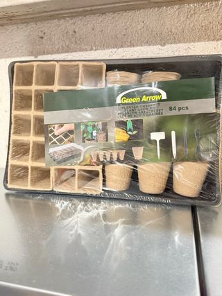 Kit completo para iniciar tu huerto en casa. Incluye todo lo necesario para el cultivo de semillas. - Bandeja con 12 macetas de turba. - Mini herramientas de cultivo. - Macetas de turba adicionales (40 unidades). - Etiquetas para plantas.