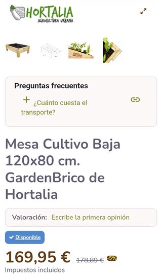 Mesa de cultivo GardenBrico de Hortalia, fabricada en madera de pino nórdico de alta calidad apta para exterior sin necesidad de barniz. Dimensiones 120x80x40 cm con profundidad de cultivo de 20 cm y capacidad de 160 L, ideal para verduras, hortalizas y plantas aromáticas en huertos urbanos. Incluye tela geotextil cosida para buen drenaje y aireación de raíces, bolsa de herrajes y manual de montaje sencillo. Estructura robusta, estable y duradera, con acabado liso y bordes redondeados para seguridad. Altura baja adecuada también para niños o personas con movilidad reducida. Perfecta para balcones, terrazas y jardines. Peso aprox....
