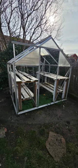 Estructura de invernadero con marco metálico y cubierta de policarbonato. Le faltan placas, la parte de abajo falta 1 o 2. En el techo faltan mas. Tiene 2 ventanas y una puerta corredera. En la puerta le falta 1 chapa y un rolamento. Las estanterias de madera, se regalan. - Ideal para proteger tus plantas del frío y la intemperie. Esta desmontado como se ve en las fotos