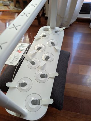 Sistema de cultivo hidropónico de dos pisos con luz LED integrada. Ideal para cultivar tus propias plantas y semillas en casa. - Estructura de dos niveles. - Iluminación LED para el crecimiento de las plantas. 2 sistemas LED, una por nivel - 16 cubiletes - 2 bandejas con 8 mini maceteros - 2 dosificadores de aigua - 8 tapats de mini maceteros Modelo KRYDDA de IKEA.