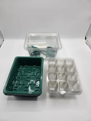 Bandeja de cultivo verde con tapa transparente para invernadero. - Bandeja de plástico verde. - Tapa transparente con ventilación ajustable.