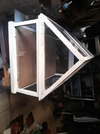 Estructura de invernadero con paneles de cristal y marco de madera. - Ideal para cultivar flores y plantas. - Diseño de esquina con apertura. - Marco de madera pintado de blanco.