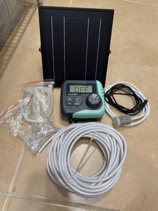 Kit de riego automático con panel solar. - Incluye temporizador digital. - Panel solar para alimentación. - Tubo de riego. - Conectores y filtro. Se ha estado usando y funciona perfectamente, ha dado servicio durante 6-8 meses regando de forma rigurosa con su depósito de agua. Precio en Amazon cuando se compró 60€
