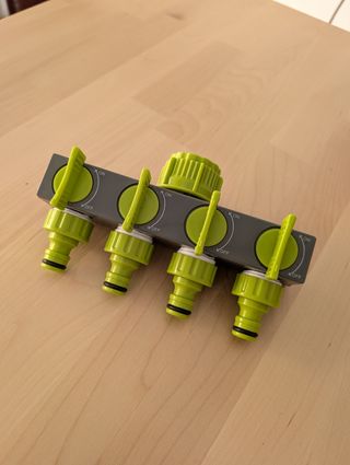 Bifurcación de 4 tomas 3/4 o manguera. Llaves de paso en cada salida.