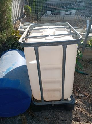 Bidón de 1000 litros con jaula metálica. - Capacidad: 1000 litros. - Material del bidón: Plástico. - Estructura exterior: Metal.