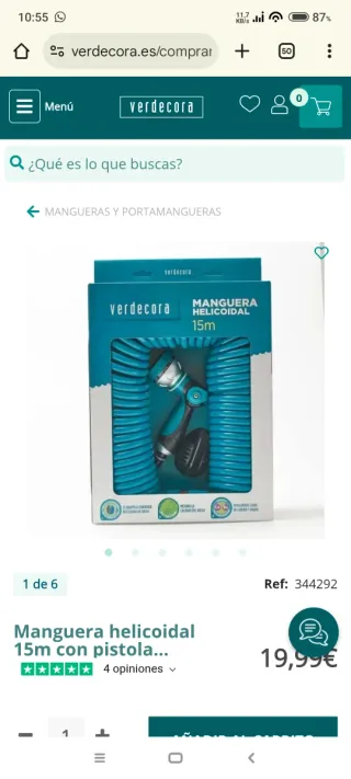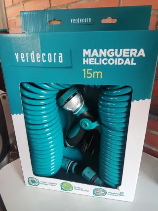 Manguera helicoidal de la marca Verdecora, con una longitud de 15 metros. Ideal para el riego. - Manguera helicoidal. - Marca: Verdecora. - Longitud: 15 metros. - Incluye pistola de riego con diferentes modos (vertical, plano, etc.). - Libre de cadmio y plomo.