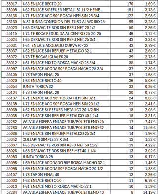 stock jimtem jardin accesorios riego agricola y agroalimentario,stock,modelos y precios en la FOTO 2 del anuncio 55017 J-63 ENLACE RECTO 20 170 1,69 € 55005 J-62 ENLACE S/REFUER METALI.50 11/2 HEMB 151 3,78 € 55136 J-71 ENLACE ACO 90o ROSCA HEM SIN 25 3/4 122 2,93 € 23130 A-82 JUNTA CONEXION DEL TUBO AL WC 65X25 99 3,23 € 55023 J-65 DERIVAC TE ROS SIN REFU MET 20 1/2 50 2,36 € 55115 J-74 TE BOCA REDUCIDA AL CENTRO 25-20-25 46 1,72 € 55024 J-65 DERIVAC TE ROS SIN REFU MET 25 3/4 43 3,34 € 55031 J-64 ENLACE ACODADO CURVA 90o 32 43 2,79 € 55037 J-62 ENLACE SIN REFUER METALICO 32 1 43 2,60 € 55072 J-73 TE BOCAS IGUAL