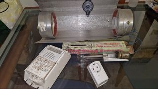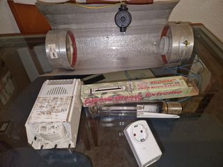 Kid cultivo interior, invernadero indoor , lampara de mercurio 600w, plafon con coiler de cristal para expulsar y controlar el calor de la lámpara ,transformador, enchufe programador y yoyo oscilante