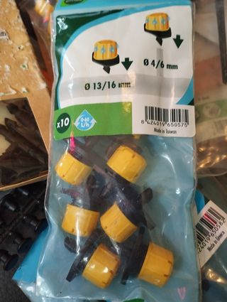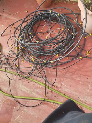 Todo lo que se ve en las fotos, de riego automático marca Geolia, en buen estado. Ideal para jardines. - Sistema de riego automático. - Longitud total de la manguera usada: 60 metros (hay más para llevar a las plantas sin usar, verla enrollada sin usar). Otra segunda manguera con 30 m. - Material resistente y duradero. -Con el punzón para agujerear la manguera. - Uno de los paquetes de bocas aspersoras está sin abrir (última foto). -Tengo también un programador con dos salidas de agua, que funciona con todo esto, en otro anuncio.