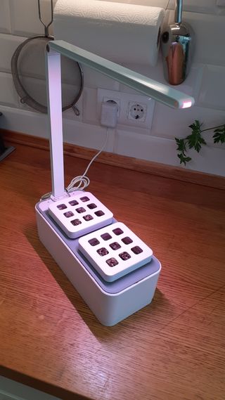Marca AmazWoW. La mejor. Jardín germinador de cocina para tener tus plantas comestibles. Funcionando perfectamente. Comprada en Amazon, ya no se encuentra. Lámpara hidropónica germinadora de semillas y especias para condimentos en la cocina con varias posiciones de luz Led (muy bajo consumo) y apagado / encendido temporizado cada 8 horas. Ver manual de instrucciones. El sustrato especial ya lo lleva. Solamente es ponerle agua hasta el nivel indicado y ver crecer tus semillas. Medidas: 39 cm alto (con la Lámpara abatida a tope/en recto, 28 cm ancho y 12 cm de fondo. Pon tus semillas favoritas y en unos días las verás crecer.
