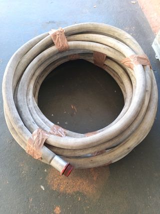 Manguera de riego de 25mm de diámetro, enrollada para su almacenamiento. -Esta en 2 tramos 1 de 15m y otro de 5m.Total 20mts - Material resistente. - Color blanco/grisáceo. - Conexión metálica en un extremo.