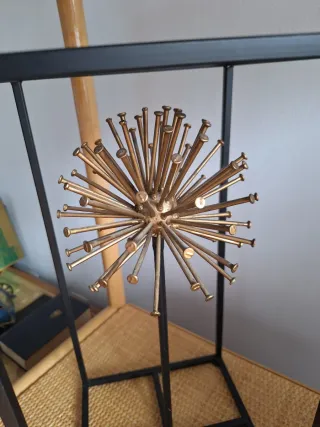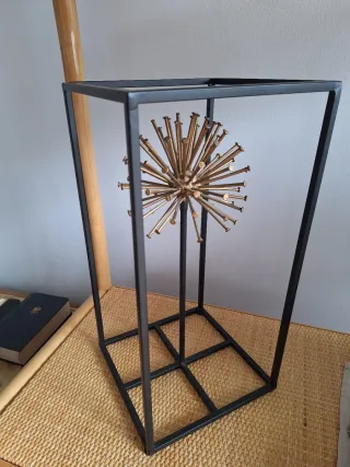 Este adorno de mesa presenta un diseño moderno y llamativo. - Estructura exterior de metal negro. - Esfera central dorada con múltiples varillas. - Base cuadrada con divisiones internas.