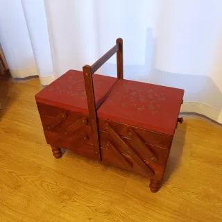 Costurero de madera, para organizar tus hilos, agujas y otros accesorios de costura. - Diseño clasico y funcional. - Múltiples compartimentos y cajones desplegables. - Asa superior para facilitar su transporte.
