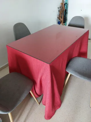 Conjunto de mesa de comedor con cubierta de cristal y cuatro sillas. - Mesa con camilla. - Cubierta de cristal. - Incluye cuatro sillas.