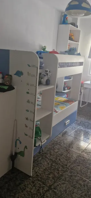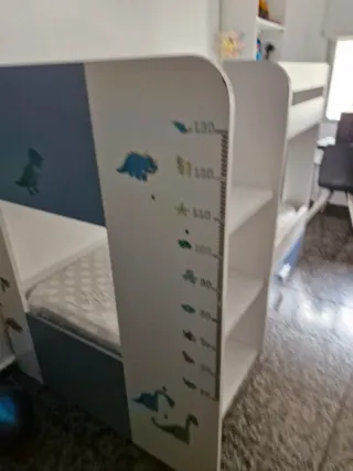 Litera con un diseño moderno y funcional. Tiene 3 camas.. colchones no incluidos. Me costo 595€. Acabado en blanco y azul. Usada pero en buen estado. No envio No rebajo Quien la quiera tiene que venir y desmkntarla.