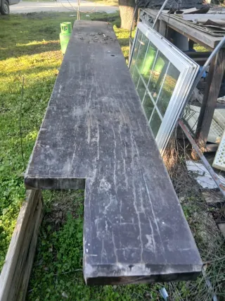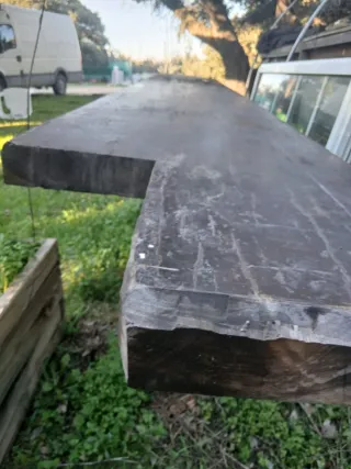 Barra de bar antigua con un diseño rústico y robusto. Tiene más de 60 años. Se encuentra en Móstoles ,Madrid. - 4 metros de largo. - Fabricada en madera de nogal. - Color negro y marrón.