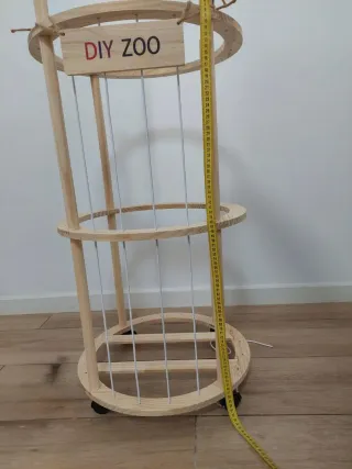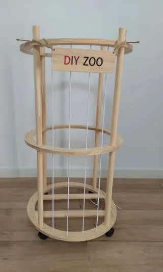 Práctico organizador para juguetes, con un diseño cilíndrico y ruedas para facilitar su movilidad. - Estructura de madera. - Barras verticales blancas. - Dos aros de madera. - Base circular con ruedas.