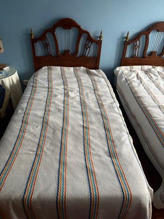 Se venden dos camas individuales completas, cada una de 105x190cm. El precio es por el set entero de las 2x camas. - Cabeceros de madera de haya maciza con diseño. - Colchones vistoelasticos de espuma de alta densidad de 30cm de alto. - Colchas a rayas multicolor + nordicos + funda nordica - Somier lámina ancha gran calidad.