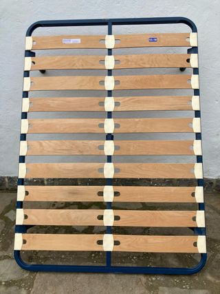 Somier para cama de matrimonio. - Estructura metálica. - Láminas de madera. - Color azul y marrón.