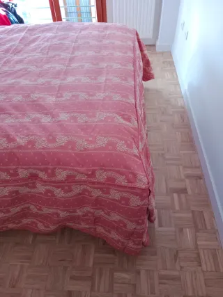 Colcha cubrecama con un bonito estampado floral en tonos rosas. Ideal para dar un toque de color a tu habitación. 181 cm de ribete a ribete ( ancho) y 240 cm de largo sin contar faldón, válido para camas de 1,50 y de 1,80. Se puede entregar en mano en distintas localidades de Aragón, si te interesa preguntame! - Diseño con motivos florales y líneas. - Acabado de tela.