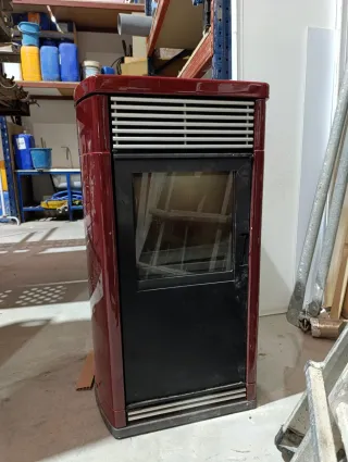 Estufa de pellets de diseño moderno, ideal para calentar espacios de hasta 80 m - Acabado exterior en color rojo brillante. - Puerta con ventana de cristal. - Rejillas de ventilación en la parte superior e inferior.