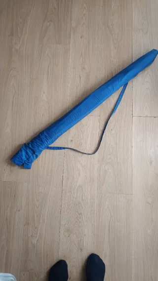 Sombrillade color azul y blanco CDE propaganda. Beds, con funda azul con asa, fácil de llevar. Es ligera y fácil de llevar. No la uso y la quiero vender. No ha sido usada, lleva tiempo almacenada y donde pone beds no está como nuevo pero el resto si. No hago envíos. - Material textil. - Correa para colgar.