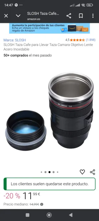 Original taza con un diseño inspirado en un objetivo de cámara fotográfica. NUEVO. - Tapa incluida. - Material: Plástico y acero inoxidable.