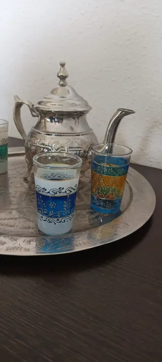 Este juego incluye una tetera, una bandeja y cuatro vasos con un diseño de estilo árabe. - Tetera de metal plateado. - Bandeja redonda de metal plateado. - Cuatro vasos de cristal con decoraciones. - Diseño multicolor en los vasos.
