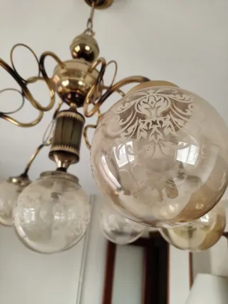 Elegante lámpara de techo con un diseño clásico y sofisticado. - Estructura principal en metal dorado. - Tulipias de cristal con detalles grabados. - Múltiples brazos para una iluminación amplia.