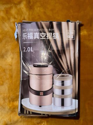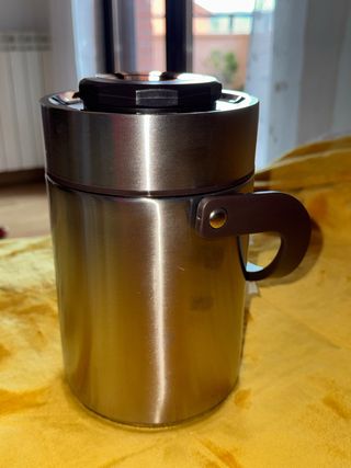 Termo metálico para transportar comidas. Ideal para mantener la temperatura de tus alimentos. - Acabado en acero inoxidable. - Asa lateral para facilitar el transporte. - Tapa con cierre seguro. - Me costo 50€