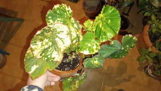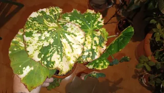 Planta de interior Begonia manicata aureomaculata con hojas variegadas. - Hojas con manchas verdes y blancas. - Borde de las hojas festoneado. - Planta en maceta de terracota. -Se envía la planta de las imágenes