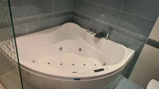 Bañera de hidromasaje tipo jacuzzi, con un diseño espacioso y moderno. - Forma angular, ideal para esquinas. - Superficie lisa y fácil de limpiar.