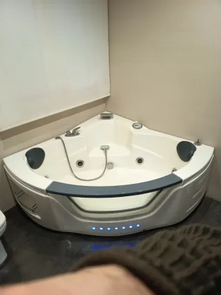Detalles del Jacuzzi: Diseño: Formato angular/esquinero, ideal para optimizar espacio sin renunciar al lujo. Capacidad: Amplio, diseñado para dos personas (incluye dos reposacabezas negros ergonómicos). Funciones: Sistema de hidromasaje con múltiples jets regulables (laterales y de fondo) para un relax total. Estado: Impecable, muy poco uso y muy bien cuidado. Detalles del Termo (Centro Comfort): Capacidad: Gran capacidad (estimada 150L), ideal para llenar el jacuzzi por completo y mantener la temperatura.