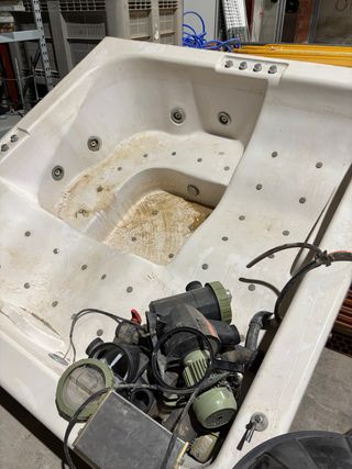 Jacuzzi de la marca Hot Spring con unas dimensiones de 210x230x100 cm. - Diseño espacioso para 5 personas. - Acabado interior en color blanco. - funciona perfectamente, estaba forrado de mármol. Por eso la parte exterior está en mal estado.