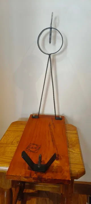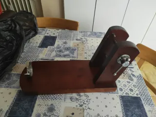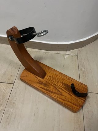 Soporte giratorio para jamón, ideal para colocarlo en la posición más cómoda y segura para su corte. Es plegable. - Base de madera. - Soporte metálico. - Diseño giratorio. Solo usado una vez, está como nuevo.