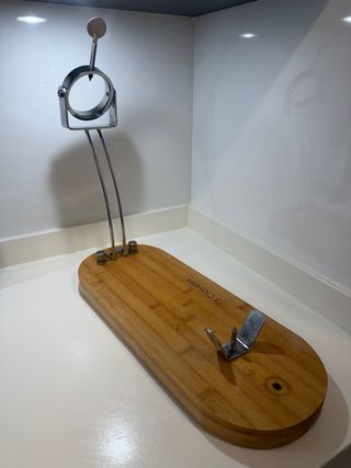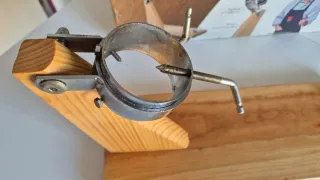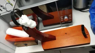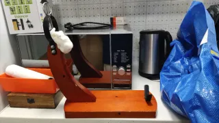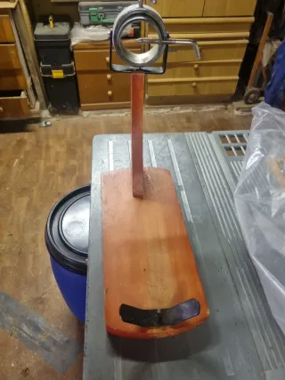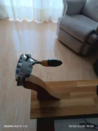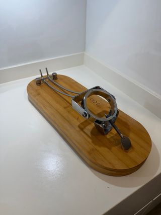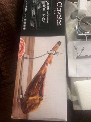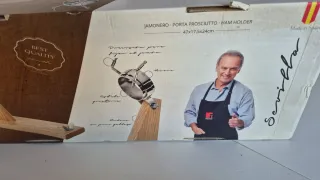 Soporte para jamón con sistema de balancín y giro de 360 grados. - Base de madera. - Piezas metálicas. - Ajuste giratorio. - Rígido y de calidad, no se mueve durante el corte. - Usado una vez y limpiado como nuevo.