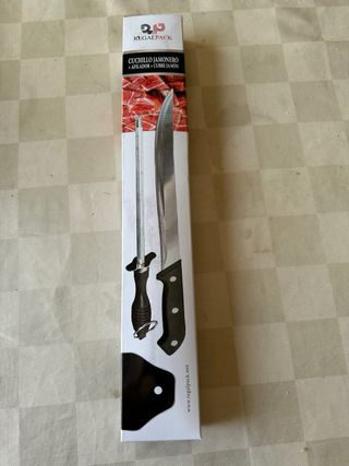 Set de cuchillo jamonero y afilador de la marca REGALPACK. - Cuchillo de hoja larga y estrecha. - Afilador para mantener el filo. - Incluye protector de plástico negro.