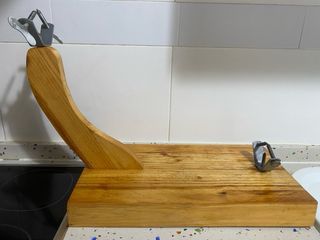 Soporte jamonero profesional tipo Góndola, ideal para jamón ibérico. Fabricado en España. - Base de corte con diseño curvo. - Incluye sistema de sujeción para el jamón. - Base de madera robusta.