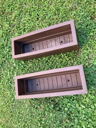 Dues jardineres de polietilè efecte acer Corten, una de sola 25 euros, les dues 40. Mides exteriors: 60 cm llarg x 20 cm ample x 18 cm d'alt.