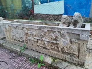 Jardinera de hormigón con un diseño único y detallado. - Relieves de caballeros y figuras. - Dos figuras de animales en los extremos. - Ideal para exteriores. Dispongo de varias unidades.