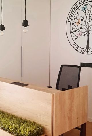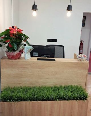 Mostrador de recepción con un diseño moderno y funcional. Incluye un espacio para plantas artificiales. - Acabado en madera clara. - Panel frontal con vegetación artificial. Incluye cajonera para almacenamiento. Recogida en persona.