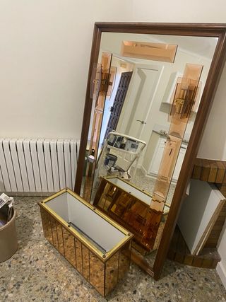Conjunto de espejo y jardinera con un diseño elegante. - Medidas del espejo: 100x170 cm. - Acabado en tonos marrones y dorados. - Materiales combinados de cristal y madera.