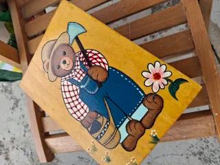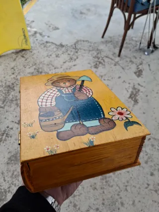 Caja de madera decorada con un tierno diseño de oso jardinero. Ideal para guardar pequeños tesoros o como elemento decorativo. Es un LIBRO FALSO - CAJA - Pintura a mano. - Diseño infantil. - Motivo de oso con herramientas y flores.