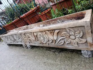 Jardinera antigua de piedra con un diseño tallado en relieve. 3 unidades de 100x30 cms. 50€ unidad 4 pies de maceta en piedra, 40x40 cms. 30€ la unidad. Macetero xon detalles de hoja de acanto. 50x50 cms. 80€ Si se llevan todo, hago rebaja.