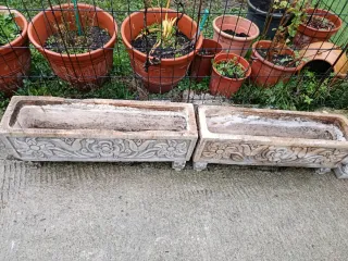 Recoger en Vilassar de Mar. SE.REGALAN varias macetas y jardineras de diferentes tamaños y materiales. Ideales para dar un toque verde a tu hogar o jardín. - Maceta de terracota. - Jardinera de piedra con relieves. - Maceta pequeña de plástico.