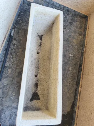 Jardinera rectangular de piedra en color beige. Por dentro se aprecia usada, pero por fuera está muy bien. - Medidas: 58 (ancho) x 22 (alto) x 19,5 (fondo) - Peso: 16kg