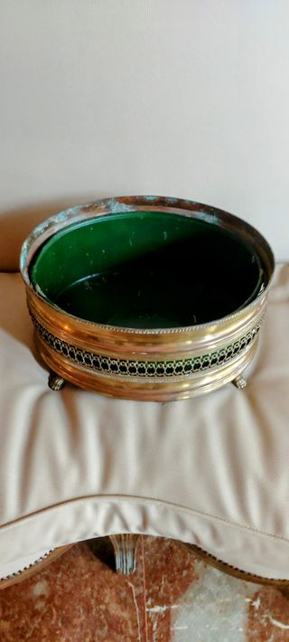 PRECIOSA JARDINERA, CENTRO DE MESA FRUTERO EN LATON CON SU RECIPIENTE DE PLÁSTICO, CON UN BELLO CINCELADO Y PATAS EN FORMA DE LEON...BRONCE COBRE DECORACIÓN VINTAGE SE HACEN ENVIOS