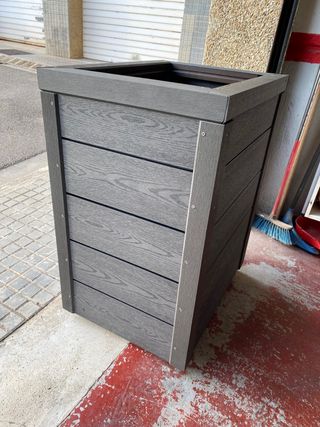 Macetero o jardinera de composite (WPC) con un diseño moderno y resistente. - Material: Composite (WPC) ensamblado con rastreles de composite, tornillos Spax inoxidables, grapas de nylon con tornillos anticorrosivos, tacos antideslizantes con tornillos inoxidable. o - Color: Marrón chocolate/estriado veta madera 3D = 365€ -Color: Gris/Arena veta madera 3D= 425€ - Diseño: Paneles horizontales - Forma: Rectangular - Disponibilidad: Bajo pedido, realizo trabajos a medida, presupuesto sin compromiso. -La jardinera de foto ya no está disponible. -Adjunto fotos de los colores disponibles.